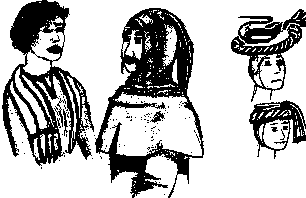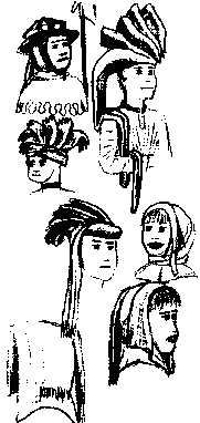 Voici après l'exemple primitif, quelques exemples plus élaborés de coupe de chaperons et de gonelle; pour plus d'exemples sur la manière de porter cette coiffe, consultez donc les magnifiques ouvrages de François Bourgeon.