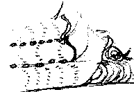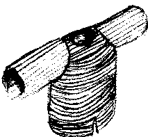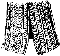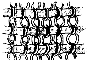 et de l'autre coté du bourrelet, fixez en même temps une nouvelle bande disposée en sens inverse. Là aussi, inutile de fignoler, faites des points assez espacés. Le bourrelet de tissu coinçant la cordelette doit masquer totalement le fil de couture. Procédez ainsi jusqu'a avoir cousu toutes les bandes posées sur votre patron. Pour finir, emprisonnez une nouvelle cordelette dans un ourlet, en attachant ainsi le dernier bord de la dernière bande d'anneaux, puis coupez le tissu restant pour finalement fermer l'ouvrage, en cousant la première bande au dernier ourlet; après avoir cousu soigneusement entre eux les deux bords du tissus ensembles.