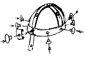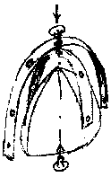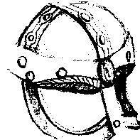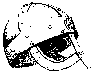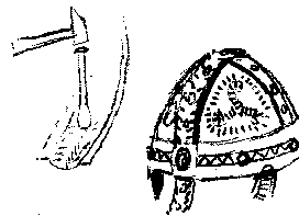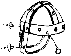 Vous pouvez aussi remplacer la garniture de cuir du casque par du métal. Pour cela, découpez quatre formes de métal en lieu et place des quatre pans de cuir, puis en vous servant d'une bûche creusée de manière à la rendre concave et d'un marteau à tête ronde (tête de préférence polie), bombez les quatres pans de métal de manière identique. ensuite, vous pourrez les riveter au longerons et au bandeau comme décrit précedement.