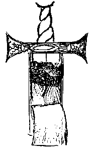 Celui ci à cependant une section laidement et inconfortablement rectangulaire. Et bien limez maintenant ! Affinez (pas trop) le fourreau. Arrondissez les angles. Sculptez arabesques dragons et gargouilles si le coeur vous en dit. Poncez, peignez, vernissez, ou recouvrez de tissu ou de cuir. Vous pouvez maintenant protéger et suspendre votre étui comme décrit plus loin. (Cependant, des bouterolles en métal sont ici préférables a celles de cuir du fourreau en carton -)`.