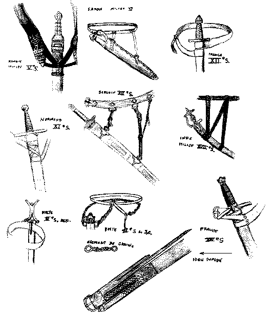 C'est bien beau d'avoir un beau fourreau, mais si c'est pour le tenir à la main, ou le coincer et le bousiller dans une ceinture, c'est plutot dommage. Pouvoir le suspendre à une bandoulière ou un ceinturon est nettement mieux. voici donc, ci après quelques exemples témoins de diverses époques à vous de voir celui ou ceux vous convenant où improvisez en un, si ceux ci ne sont pas a votre convenance.