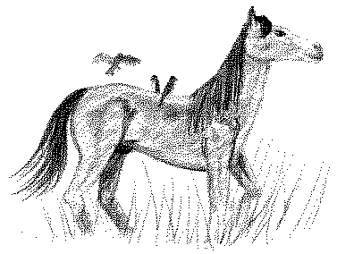 Pour faire ressortir les reliefs, comme d'habitude, peignez de couleur plus sombre les creux entre les muscles et éclaircissez les reliefs. Si il a fourni des efforts importants, le cheval sera en sueur, le poil étant mouillé, sa robe se fera plus sombre et plus terne. L'oeil s'entourant d'une tache sombre. L'animal que vous peignez à de fortes chances d'être harnaché. Son cavalier ne montant sans doute pas à cru. Par conséquent, lors de l'effort, les lanières en frottant le pelage fera en quelque sorte mousser la sueur en cet endroit. Cela se traduit par des rayures de mousse blanche autour des points de frottement des cuirs.