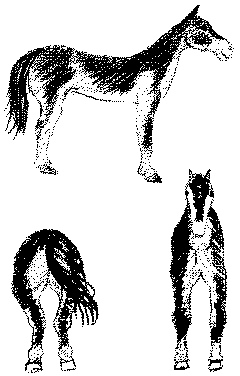 Pie alezan, pie bai ou pie noir sont ceux que l'on distingue en fonction de la couleur des taches irrégulières répandues sur leur robe blanche. En respectant bien le sens des poils, vous obtiendrez avec votre pinceau l'effet d'effilochage propre aux taches réelles sur leur bords