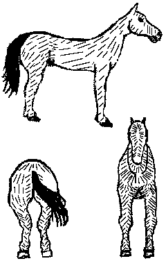 Bon en gros, il y a trois grandes sortes de chevaux : Les gris, les marrons et les noirs. Au delà des crinières et des taches à la figure et aux membres; il est très rare qu'une robe soit de couleur uniforme. le corps à généralement une couleur plus foncée sur le dessus que sur le dessous. Le premier shéma montre la répartition générale des zones claires et sombres sur la robe.