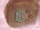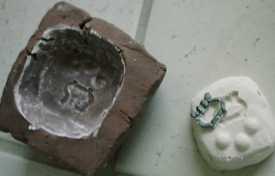 Il ne reste plus qu'a imaginer où est ce que celà pourrait être le mieux de tailler une cheminée de coulage pour que le métal se répartisse bien partout, et tailler cette cheminée (pensez à ces petites choses comme la loi de la gravité, pazr exemple). Quelques petites fentes au couteau, allant de la pièce vers l'extérieur sont utiles si l'on a utilisé de l'élastomère, pour que l'air puisse être chassé par le métal (pas trop grands non plus il ne faudrait pas que le métal en fusion traverse le moule de part en part) (ne procéder ainsi que sur un coté). Les petites fentes sont facultatives pour de petits moules en platre, celui ci étant bien moins étanche que les élastomères. Et ça y est, le moule est fini.