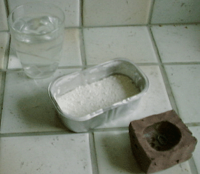 Là, on fait fondre du métal dans la casserolle, puis en maintenant le moule au dessus de trucs ne craignant pas du métal en fusion qui dégouline (vieille assiette en céramique, contractuelle, carelage..), on fait couler le métal dans la jolie cheminée qu'on a taillée avec amour. (Remplir la cheminée à fond, on coupera le métal en trop à la pince pour le refondre, pas de chutes perdues en fonderie).