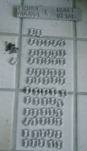 Reste à couler le métal... Là, il faut : Une source de chaleur suffisante (cuisinière, Lucienne du "chien à six pattes, chalumeau, etc...) des pinces à même de tenir le moule fermé et loin de ses petit doigts allergiques aux t° dépassant une pincée de centaines de degrés celcius Du métal (soudure, à figurines) Une tite casserolle pas en alu (à ces températures là, ça fond) avec bec verseur du bon coté incorporé (Prince August vend ce type de matériel bien utile dans tous les bons magasins de figurines, ou "rougié et pié".)