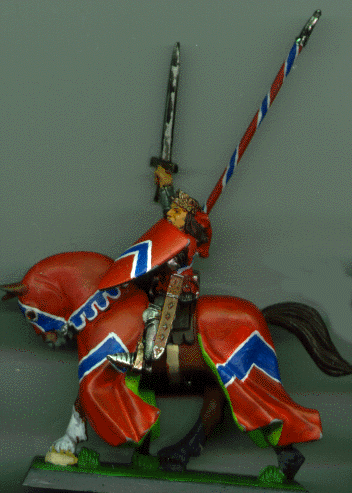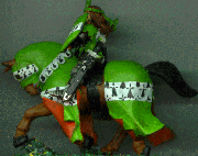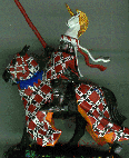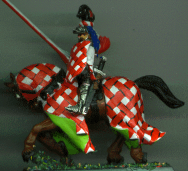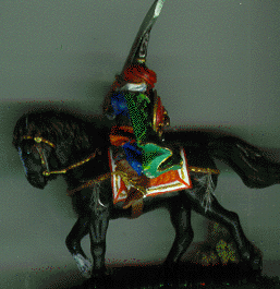 - Tapis de selle : de gueules semé d'ondines oranges à la bordure d'argent, chargée d'une bordure d'or.