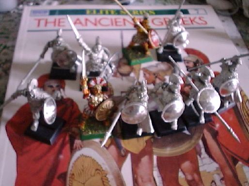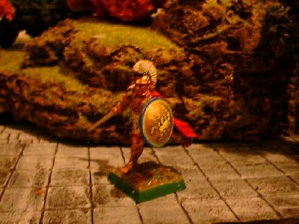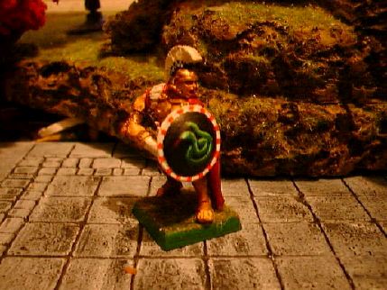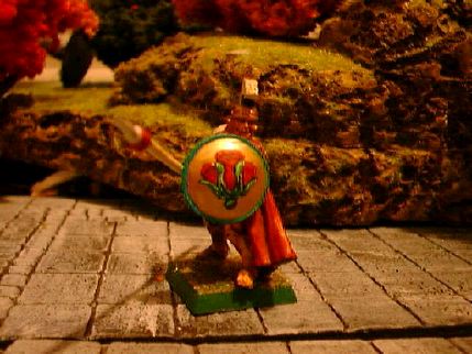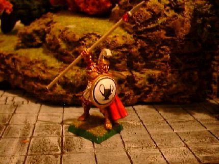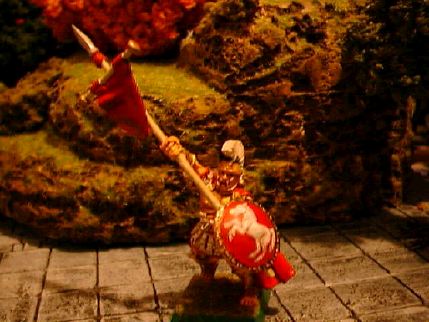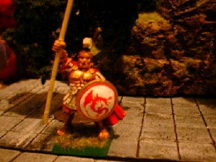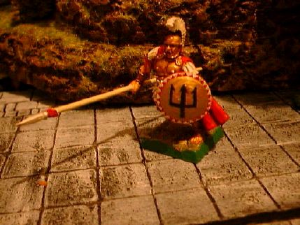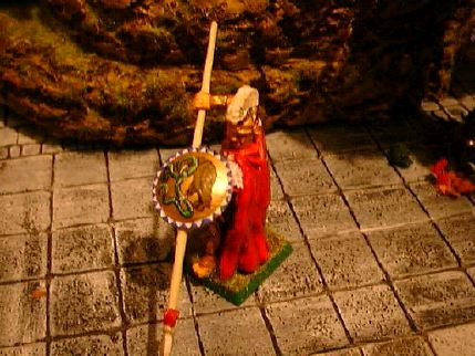 En pliant un peu la jambe droite vers l'arriere, a la main. Puis en utilisant une pince plate pour détacher la crète, et la recoller dans l'autre sens. Ensuite un coup de pince coupante décolle le bras gauche du corps, avant de plier un peu le bras droit vers l'avant en profitant qu'il à toujours son épée pour orienter la main dans une autre direction. Pour continuer, à la pince coupante, et la perceuse, j'ai remplacé l'épée par une pique (après avoir fait un régiment de piquiers de Pirazzo, il m'en restait un petit nombre dans ma boite à rabio) et avec l'aide d'un peu de green stuff (appelé aussi duro, ou de son vrai nom kneadatite) avant de limer le bouclier pour le rendre lisse puis le coller, et il n'y avait plus qu'a peindre, pour obtenir ça :
